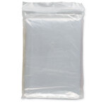Foldable plastic poncho with attached hood, packed in a transparent polybag.