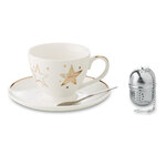 Teacup set: ceramic mug with star decal, spoon and tea holder. Presented in carton box with PVC sleeve and ribbon with label.