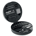25 piece tool set in tyre shaped box including 1 extender, 1 socket screwdriver, 1 nose plier, 5 sockets, 3 hex keys, 10 bits set, 2 precision screwdrivers and 1 tape.