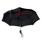 Foldable 21 inch umbrella,3 sections, fibre glass ribs in matching colour, auto open and closure, 190T pongee black with matching colour stitching, black metal shaft, handle black with matching colour details.