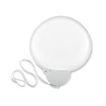 Foldable 190T polyester fan with hanging cord and safety buckle.