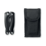 Foldable multi-tool in stainless steel with stainless steel pliers. 9 tool functions. 600D polyester pouch included.