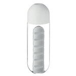 600 ml tritan bottle with integrated and detachable 7 slot pill box.