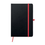A5 notebook with PU cover and 96 lined pages with matching ribbon and elastic band. It has a pen loop and pocket on back cover. Your logo will show up in matching colour after laser engraving.