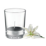 Fragranced small candle in transparent glass holder with coloured tea light.