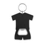 T-shirt shape bottle opener in ABS with key ring.