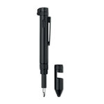 Multifunctional stylus tool pen in ABS matt finish with torch, screwdriver, phone stand, decorative compass, LED with white light.