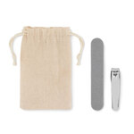 Manicure set in a cotton drawcord pouch. Includes a nail file and a nail clippers.