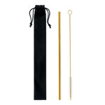Set of 1 reusable stainless steel drinking straws and cleaning brush in microfiber pouch.