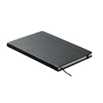 A5 notebook with hard PU cover. Casebound. 200 lined pages (100 sheets) in recycled paper (80 gsm). Matching elastic closure strap and ribbon page-marker. Made in EU.