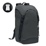 Outdoor backpack in 190T polyester coated with reflective granules. Side zippered outer pocket and padded back, inner lining with drawcord closure. One large padded inner laptop compartment. It has adjustable padded shoulder straps and adjustable chest and waist strap with buckle closure. Water repellent.